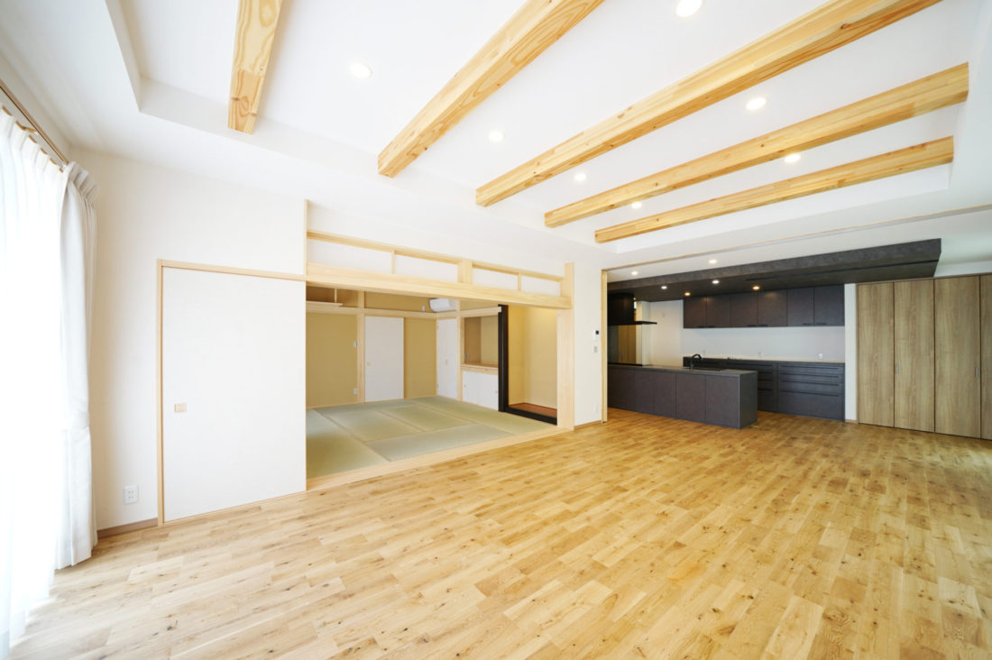 檜ムク7寸角を標準仕様としたつくばモデルハウス。明るく開放感のあるリビングでは、6mの吹き抜け設計が圧巻です。全体的に和モダンな雰囲気を漂わせながら、生活感を感じさせないスタイリッシュな印象でまとめています。
